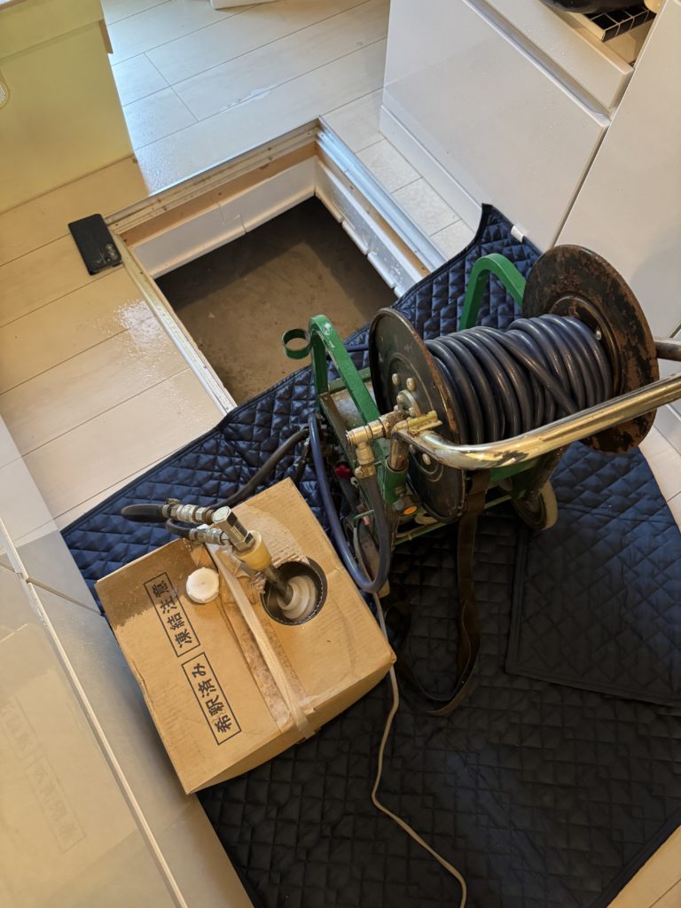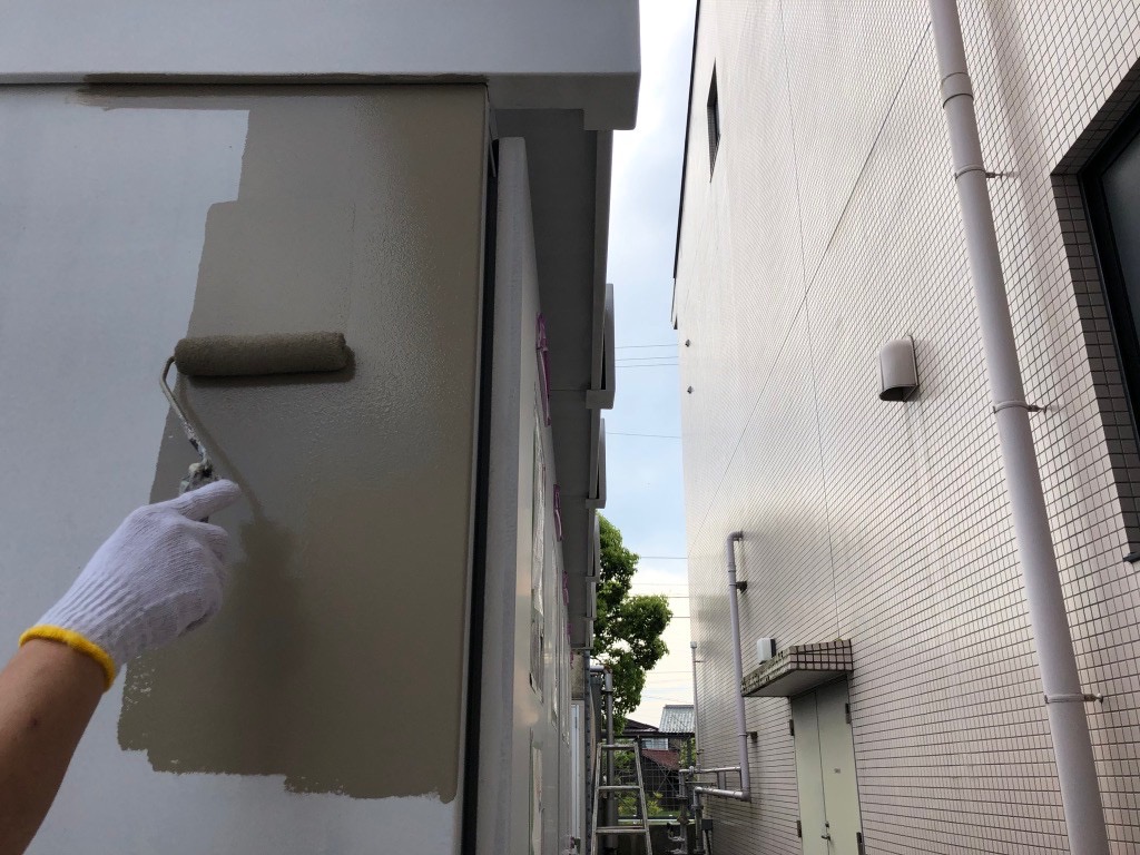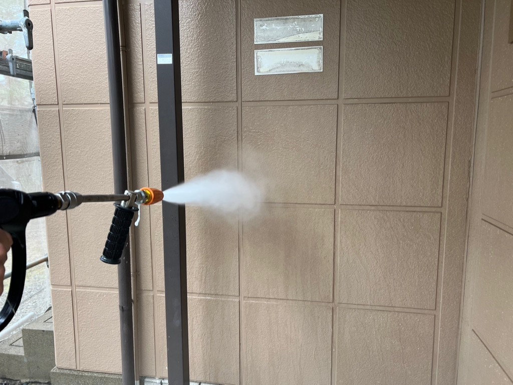 汚れなどを落とすため高圧洗浄で洗い流します。その後、下塗り・中塗り・上塗りの順に塗っていきます。